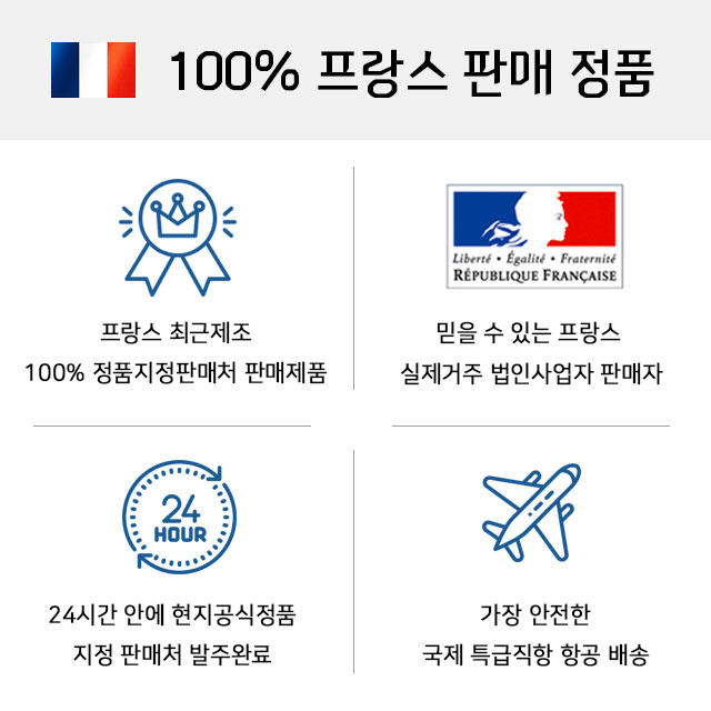 저희 쇼핑몰에서 판매되는 모든 제품은 프랑스 현지인에게 현재 유통되는 오리지날 최근 제조의 새 제품으로 바잉된 새 제품 그대로의 제품이며, 한국으로 직배송 해드리고 있습니다.