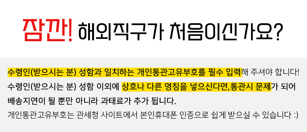 ※ 중요 ! 상품 주문시 “ 개인통관고유부호 ”는 반드시 꼭 수령인(받으시는 분)과 일치하여야 통관이 진행됩니다.