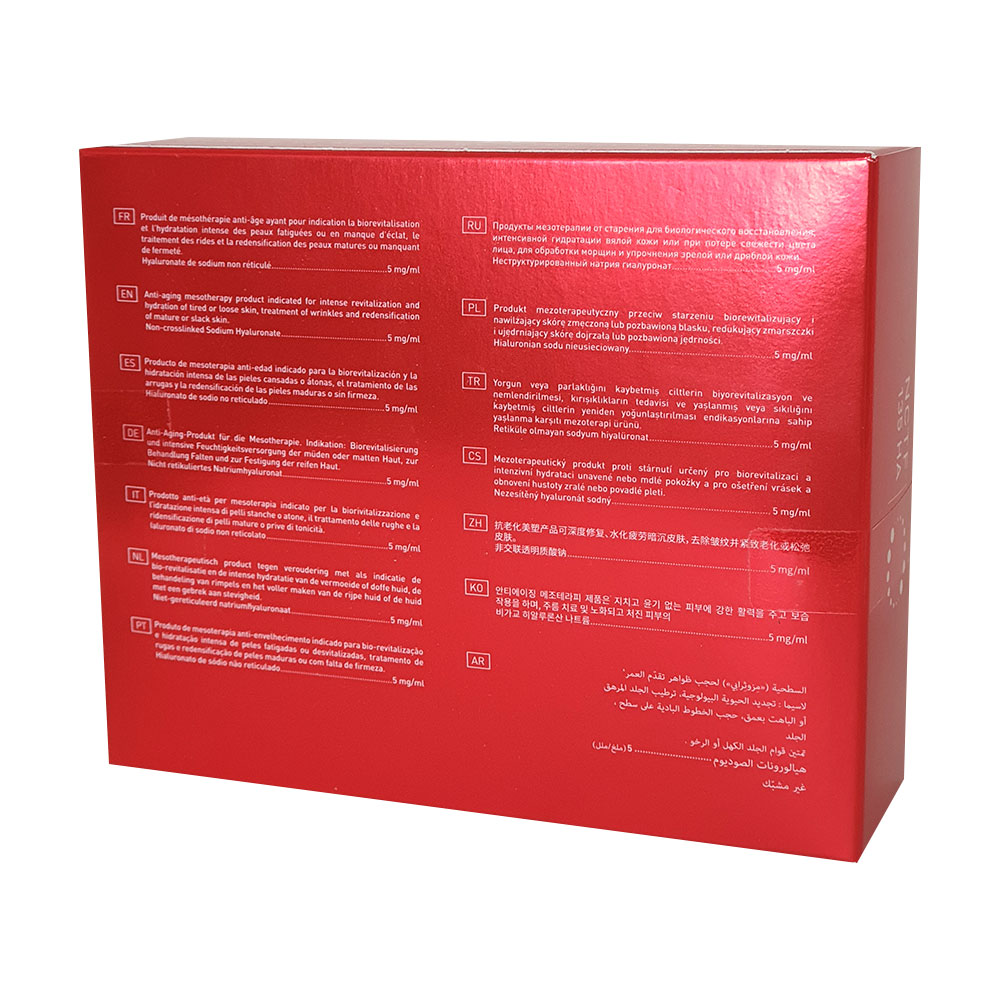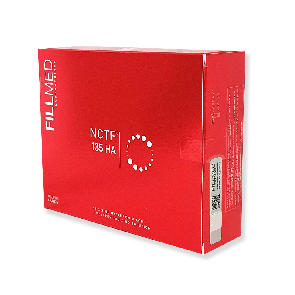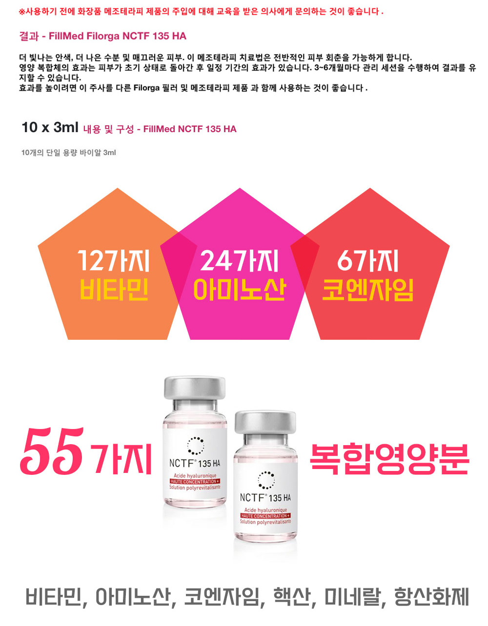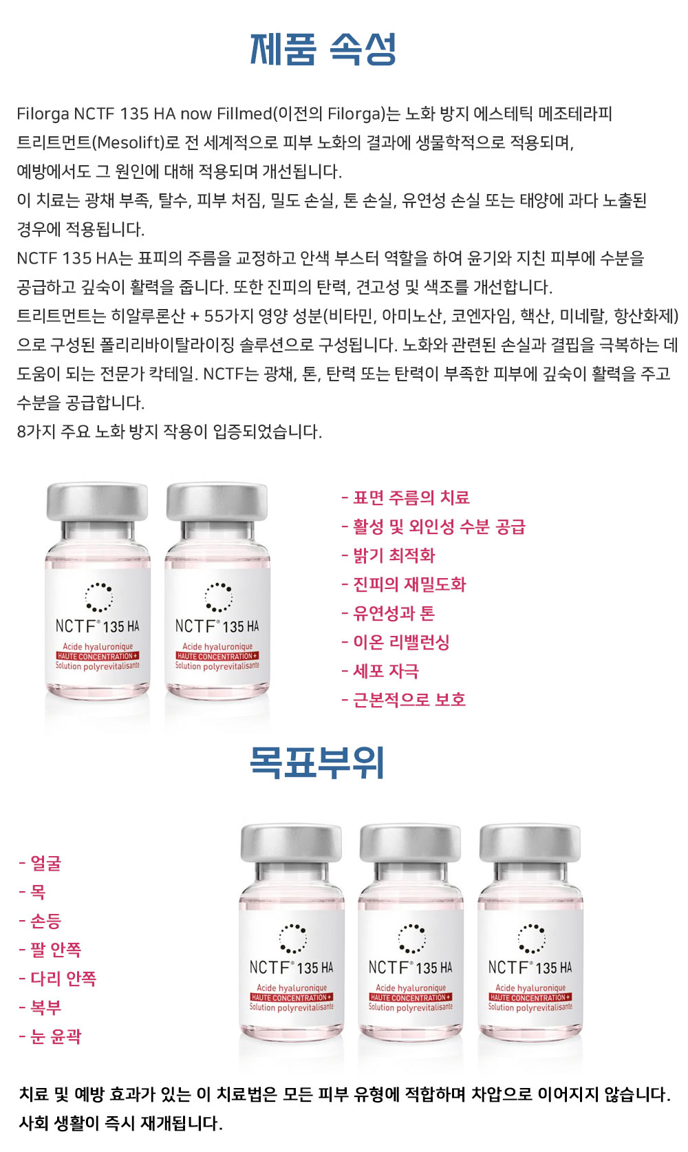 NCTF® 135HA: 안티에이징 메조테라피 제품은 지치고 윤기 없는 피부에 강한 활력을 주고 보습 작용을 하며, 주름 치료 및 노화되고 처진 피부의 재강화 작용을 합니다. NCTF® 135HA 는 다음 부위의 표피 또는 진피에 주사하도록 제조되었습니다. • 얼굴(눈 주변부 포함) • 목 • 가슴골 부위 • 손 윗면 • 팔 안쪽 면