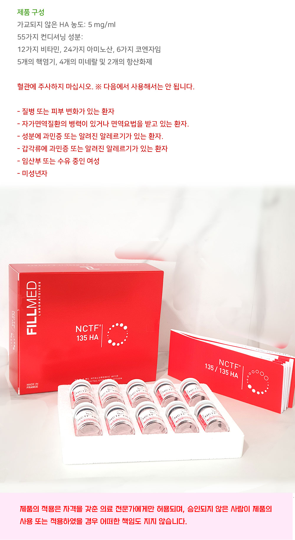 조성 히알루론산 농도(mg/ml) NCTF® 135 비가교 히알루론산 나트륨 0.025 NCTF® 135 HA 비가교 히알루론산 나트륨 5.00 폴리리바이탈라이징 용액 12 가지 비타민 아스코르브산(비타민 C) 비오틴(비타민 B8) 판토텐산(비타민 B5) 엽산(비타민 B9) 이노시톨(비타민 I) 니코틴아마이드(비타민 B3) 피리독신(비타민 B6) 리보플라빈(비타민 B2) 티아민(비타민 B1) 토코페롤(비타민 E) 레티놀(비타민 A) 비타민 B12 6 가지 미네랄 염화칼슘 염화칼륨 황산마그네슘 아세트산나트륨 염화나트륨 인산이수소나트륨 5 가지 핵산 데옥시아데노신 데옥시시티딘 데옥시구아노신 데옥시티민 5-메틸-2’-데옥시시티딘 24 가지 아미노산 α-아미노부티르산 알라닌 아르기닌 아스파라긴 아스파르트산 시스틴 글루타민 클루탐산 글리신 히스티딘 히드록시프롤린 이소류신 류신 라이신 메티오닌 오르니틴 페닐알라닌 프롤린 세린 타우린 트레오닌 트립토판 티로신 발린 6 가지 코엔자임 TPP(코카복실라아제) CoA(코엔자임 A) FAD(플라빈 아데닌 디뉴클레오타이드) NAD(니코틴아마이드 아데닌 디뉴클레오타이드) NADP(니코틴아마이드 아데닌 디뉴클레오타이드 인산) UTP(우리딘 삼인산) 기타 글루타치온 폴리소르베이트 80 글루쿠론산 글루쿠론산 락톤 글루코사민 무수덱스트로오스
